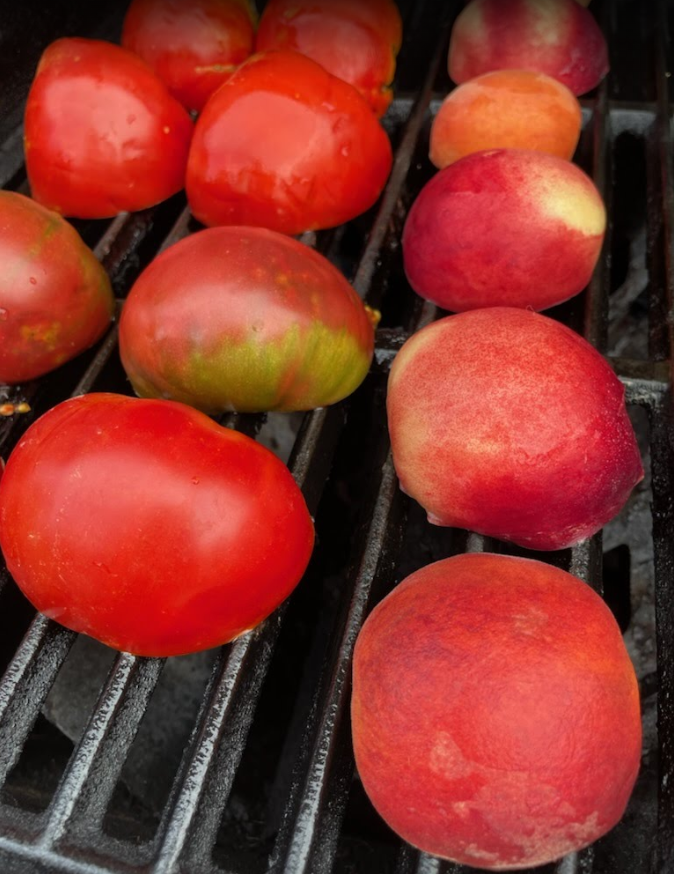 Grill tomato and peach halves until slightly charred, about 5 minutes, flipping half way through.
